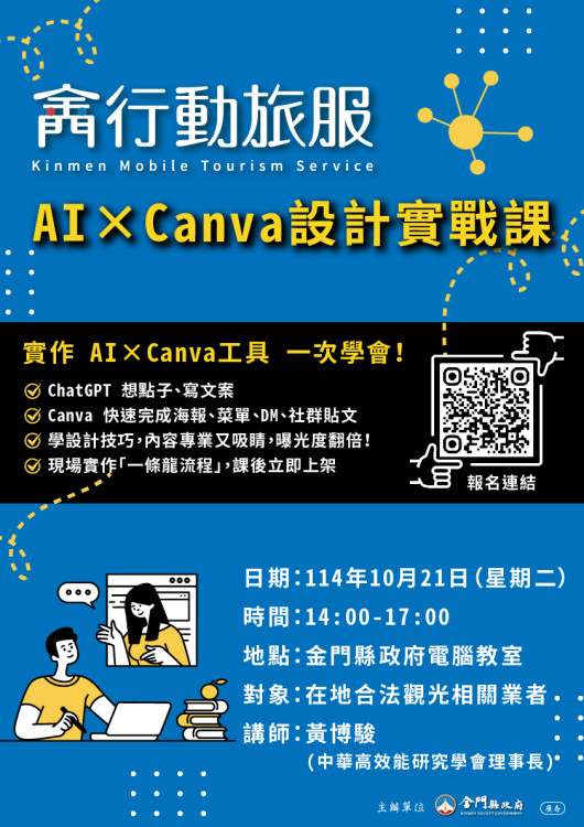 金門縣觀光處表示,「AI×Canva設計實戰課」將於10月21日(二)下午14時在金門縣府電腦資訊教室舉行;邀金門合法觀光相關業者(旅宿、美食、伴手禮、體驗、交通租賃、旅行社等)踴躍報名參加;即日開放報名,每店限額1人,限額35名,額滿為止;報名表單連結:「https://forms.gle/BnY25tLRAjd55pex5」。(金門縣政府提供照片)