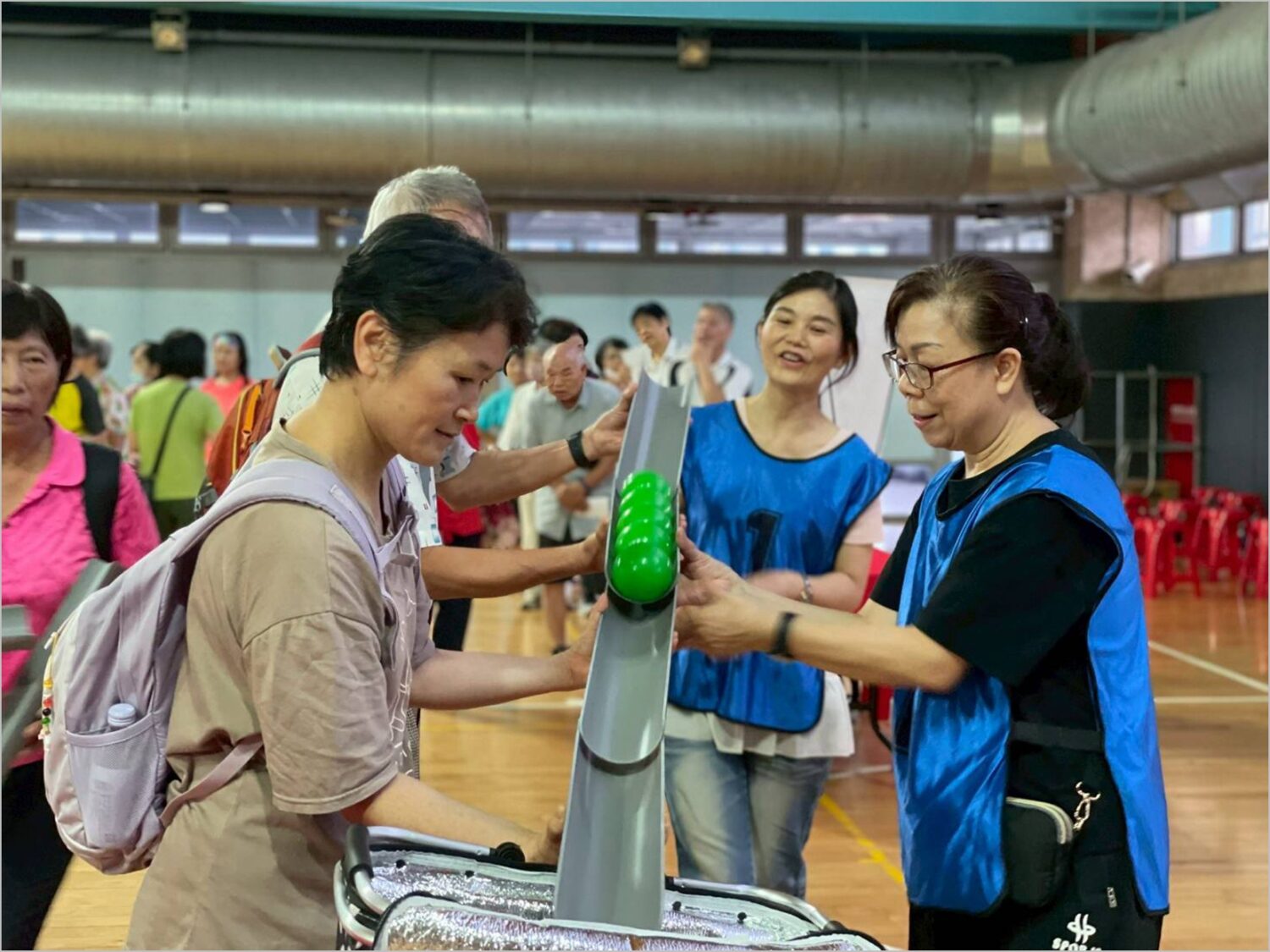 活動內容規劃「個人趣味運動」及「團體合作挑戰」,包括快步桃園道、銀動十連拍以及滾球接力等 ,透過寓教於樂的方式,讓參與長者在運動中感受團隊合作與健康樂活的喜悅。此外,現場亦設置握 力、心肺耐力、柔軟度、身體數值檢測及InBody等多項體適能檢測,協助長者了解自身健康狀況,並進 一步建立規律運動與健康管理的觀念。