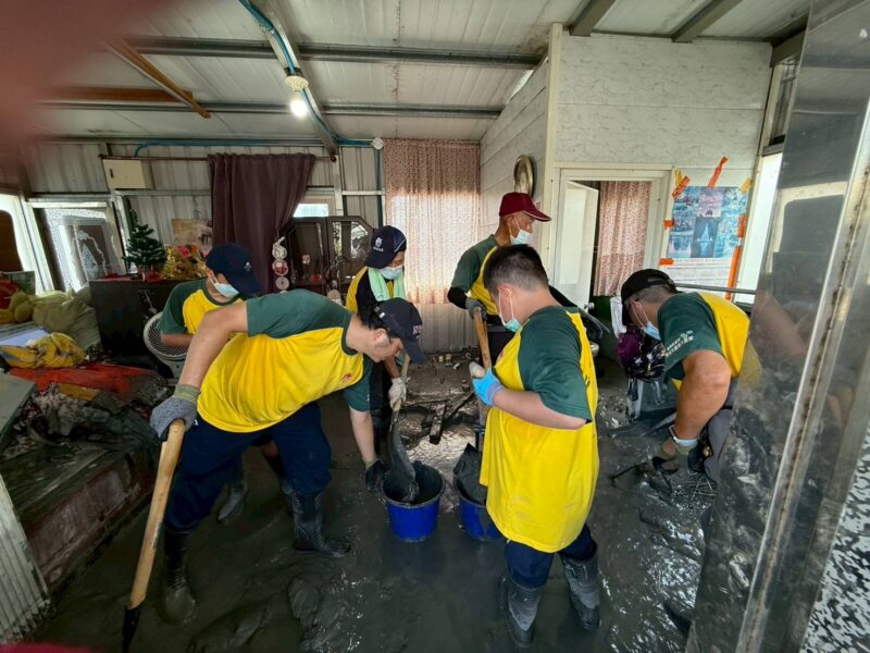 堰塞湖溢流造成大量淤泥衝向部落,導致民宅逾1600戶受災。佛光山志工自發性前進災區,陪伴災民並協助清理家園,連日來在災區發送餐食,也調度機具協助清淤。救災團隊搭配山貓機具開挖屋內深厚的淤泥,再奮力沖刷地板及被掩埋的器具,協助受災戶早日恢復平靜的生活。