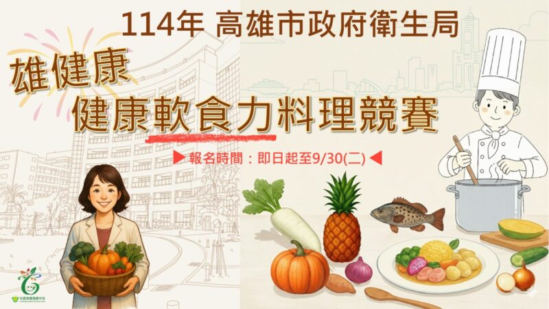 因應高齡化社會長者及特殊口腔者多元化飲食需求,高雄市政府衛生局將首度舉辦114年「雄營養•健康軟食力」料理競賽,參賽者須設計一道符合台灣飲食質地標準「7級容易咬軟質食」,且含未精製全穀雜糧、豆魚蛋肉、蔬菜三大類食材的特色料理,藉此打造友善長者的飲食環境,提升民眾對健康及質地調整飲食的認識。賽事即日起開放報名至9月30日,通過初賽書面審查後將選出10支隊伍於11月8日進行現場料理決賽。