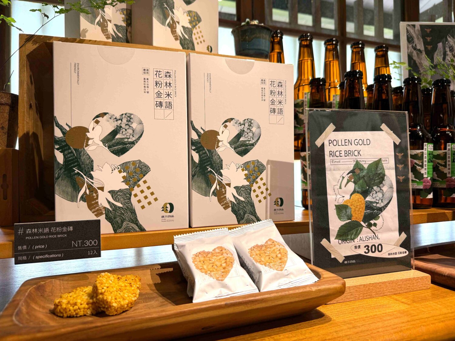 嘉義分署表示,森林米語花粉金磚米餅融合米食與森林蜂產品的全新體驗,一口咬下即可見中心的金黃色澤,展現羅氏鹽膚木及茶花粉的天然色彩,口感層次豐富,充滿米香與蜜香順口不膩,是市面上獨一無二、老少咸宜的精緻小點心,另外加上典雅的包裝設計,更是民眾來嘉義最佳伴手禮選擇;今年度「林下良品」陸續推出結合阿里山森林蜜開發的「阿里山森林蜜啤酒」、融合具嘉義地區獨特基因的諸羅山茶回甘香氣的「諸羅山茶啤酒」,以及融合嘉大節水米與阿里山森林蜂花粉所烘製的「森林米語花粉金磚」,嘉義分署期盼這些創新產品能讓林下經濟政策更貼近民眾日常生活,隨時都能品嘗到森林最純真的美味,同時以消費實際支持永續森林經營理念。