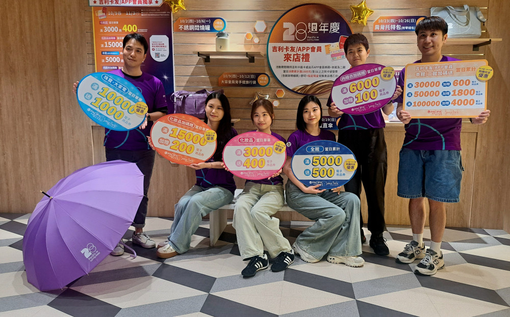 今年下半年新增3個國定假日,屏東太平洋百貨搶先回饋返鄉顧客,於中秋連假檔期即推出週年慶預購優惠,更以「天天滿仟送佰 週週卡友來店禮」為特點,提供顧客好康六重送,第一重~化妝品品牌推出一年一次消費即享9折起折扣;第二重~卡友/會員於化妝品當日單筆滿3000送400(電子商品券300元+抵用券100元)、本館(部份專櫃除外)當日累計滿5000送500;第三重~化妝品當日單筆滿15000元再加贈200元(每日每卡一次)、內睡衣當日單筆滿6000元加贈100元(可累贈);第四重~即日起~10/22(三)第一波加碼,全館(部份專櫃除外)當日累計滿3萬再加贈600元、滿5萬加贈1800元、滿10萬加贈4000元;第五重~高單價顧客整檔期再回饋,週年慶整檔期期間新增一門檻,滿28萬加贈象印快煮電氣壺(市價3700元)、滿38萬再加贈5000元、滿50萬再加贈10000元(擇一門檻兌換,每人可兌換乙份贈品);第六重~優雅粉紫色調系列卡友禮週週送,總回饋金額優於去年,各項專屬回饋,等您來歡慶。
