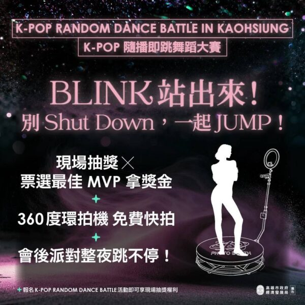 全球大勢女團BLACKPINK世界巡迴演唱《DEADLINE》高雄場,即將於10月18、19日 (六、日)在世運主場館登場,預計吸引近十萬歌迷前來朝聖。為迎接廣大海內外BLINK再次齊聚高雄,高市府除延續兌換面額50元的商圈夜市優惠券,更推出一系列應援響應活動,「韓味美食JUMP吃最優惠」串連高雄在地20家韓食餐廳推出十月份樂迷專屬優惠,與高雄知名舞蹈教室及餐酒館聯手舉辦「K-POP RANDOM DANCE隨播即跳舞蹈大賽」,於演唱會前夜10月17日在中央公園商圈舉行。同時10月17日至19日將在高雄捷運左營站發券櫃檯,設置演唱會主視覺打卡牆,邀請粉絲們一起提前熱舞暖身、打卡留念,讓追星體驗再升級。