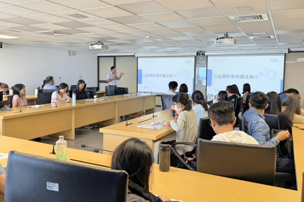 《公益揭弊者保護法》前於114年1月22日公布,同(114)年7月22日正式施行,這是國內第一部專門保障揭弊者的法律,制度設計包含「三保一減」──身分保密、人身安全保障、工作權保障,以及責任減免,藉此確保揭弊者能無後顧之憂揭露不法行為。該法同時要求主管機關建立完整流程,避免揭弊者遭受打擊或報復,強化整體制度可信度。本次特別安排課程,讓同仁熟悉法制內涵與權益保障,也透過案例解析,使大家理解揭弊案件在實務操作上可能面臨的挑戰與保護機制。