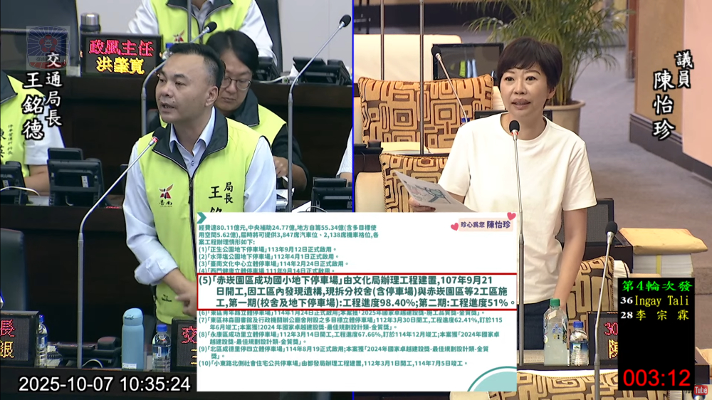 【勁報記者杜忠聰/臺南報導】台南市議員陳怡珍今日在市議會質詢中指出,赤崁園區成功國小地下停車場位於市區停車熱點,長期以來「一位難求」,周邊商家與居民都殷切期盼停車場早日啟用,但市府多次跳票,讓民眾深感失望。市府目前預計待一、二期工程皆完成後,明年3月可望取得使用執照,最快明年6月完工開放。陳怡珍要求市府掌握進度、協助文化局加速完工,讓停車需求早日獲得紓解。
