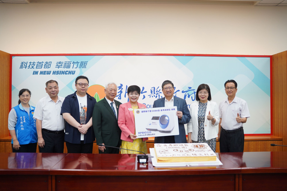 ▲國際獅子會300B6區黃秀卿總監(左5)捐贈醫療級隧道式血壓機1部給新竹縣政府,由縣長楊文科(右3)代表接受。(圖/竹縣府提供)