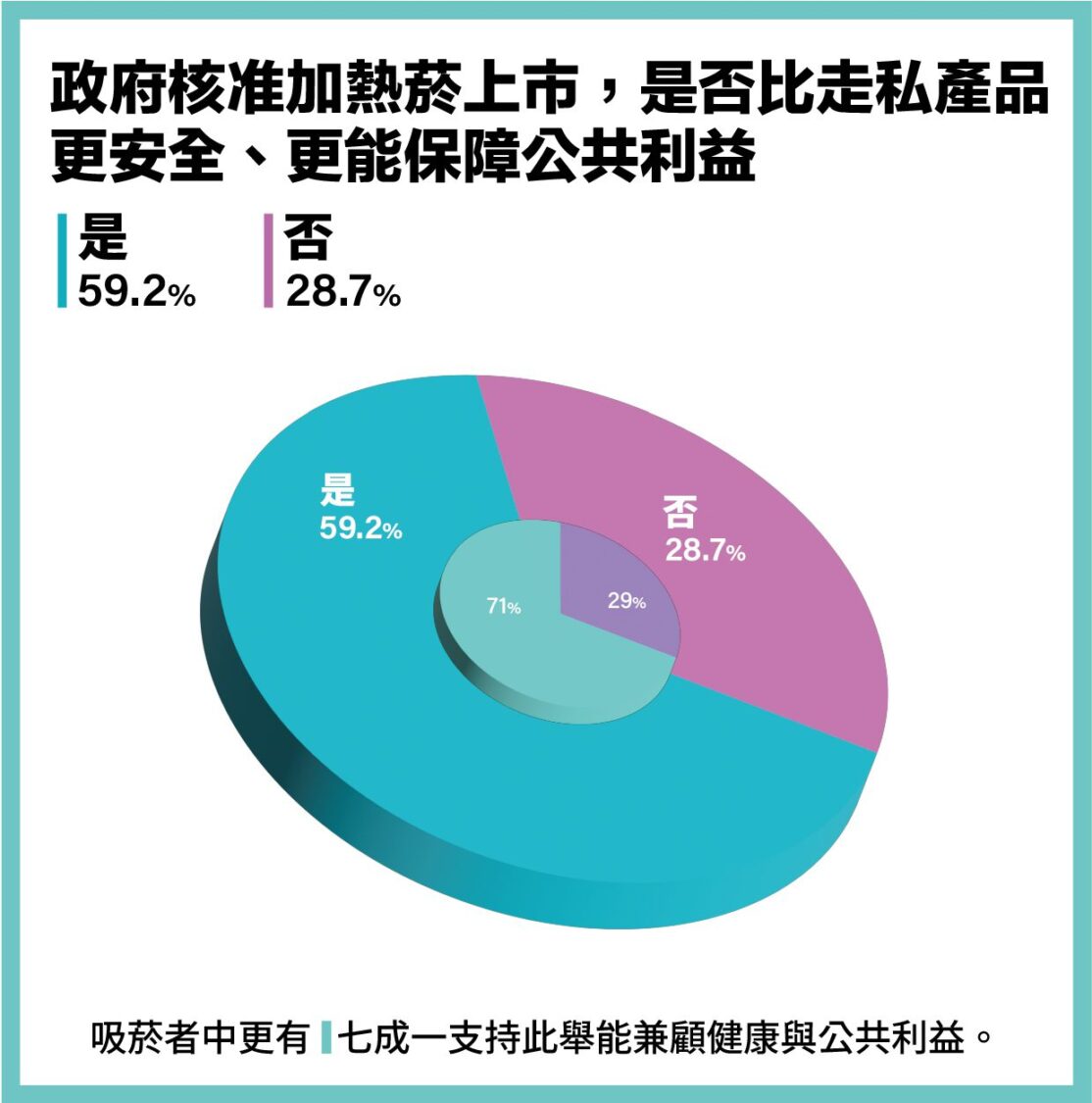 在「政府核准加熱菸上市,是否比走私產品更安全、更能保障公共利益」的題項,59.2%民眾持肯定態度,僅28.7%不認為。吸菸族群更有七成一支持此舉能兼顧健康與公共利益。專家指出,這顯示多數民眾對「管理勝於禁令」的方向已形成共識,期盼政府加強宣導與稽查,建立透明安全的市場環境。