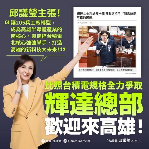 邱議瑩認為,205兵工廠位於高雄亞灣區的核心,有58公頃的腹地,鄰近捷運站、交通便利,生活機能也十分完善,是最適合輝達台灣總部落腳的所在地。若未來輝達投資,205兵工廠轉型成為高雄半導體產業的南核心,與楠梓的台積電北核心強強聯手,打造高雄的新科技大未來。