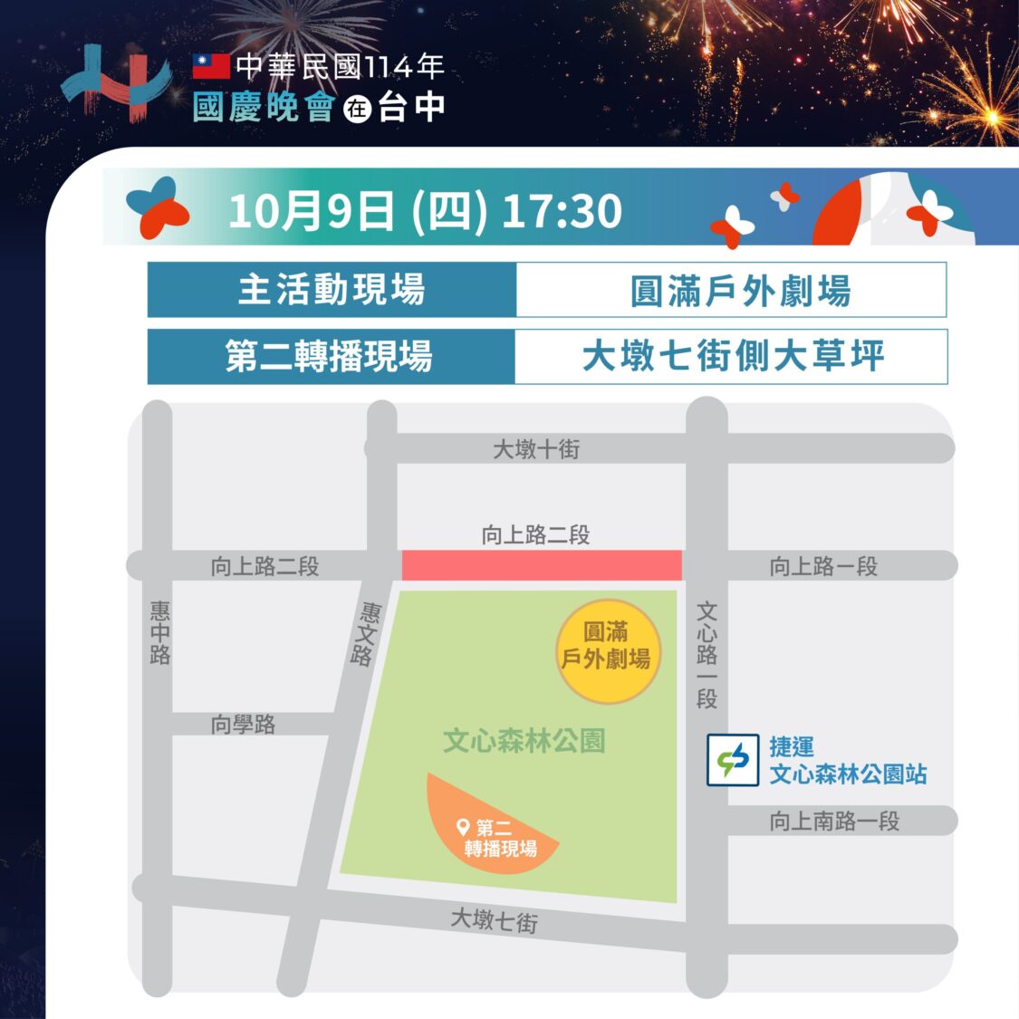 國慶晚會主會場「圓滿戶外劇場」於10月9日16時30分起開放排隊進場。市府更於文心森林公園大墩七街側大草坪規劃「第二轉播現場」,特別設置400吋超大螢幕,預計自17時30分起,透過高亮度、色彩鮮艷的巨型LED電視牆同步播放晚會節目,讓場內可容納6,000名的觀眾免排隊、免索票,近距離感受現場氛圍,與全場一同歡慶國家生日。