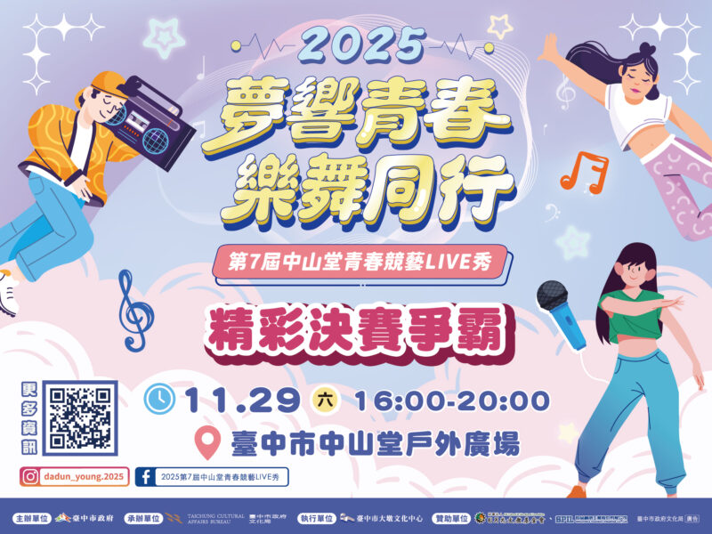 【 News586/記者黃秀卿報導】今年度最受矚目的全國學生音樂舞蹈大賽再度登場!由臺中市政府文化局舉辦「中山堂青春競藝LIVE秀」已邁入第7屆,已成為青年學子展現才華、挑戰自我的重要舞台。今年以「夢響青春.樂舞同行」為主題,徵件活動即日起開跑,報名至10月22日截止。將評選出20組團隊,進入11月29日的決賽舞台角逐最高榮譽與豐厚獎金,釋放音樂與舞蹈的無限青春能量。