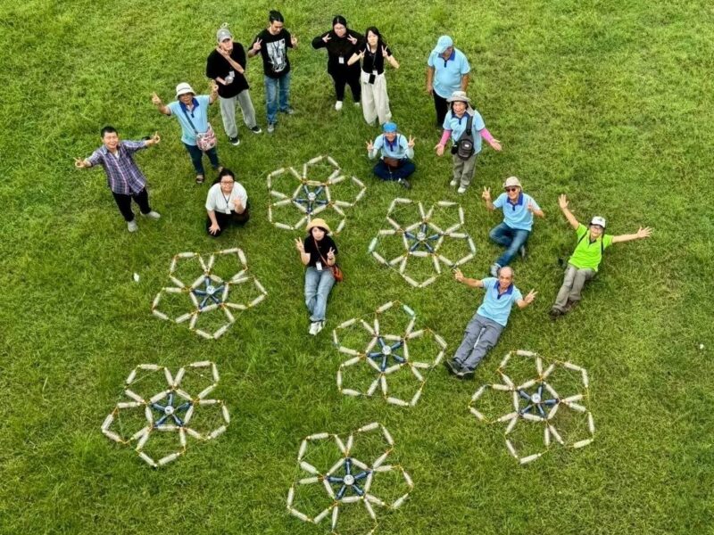 黃琬雯表示,作品靈感來自濕地常見的被子植物五瓣花與水生植物維管束切面,呈現自然中的幾何秩序之美。團隊以回收寶特瓶構築漂浮結構,並以螢光骨架連結出五邊形與十邊形的分形形式。白天,作品化為漂浮於水面的寶特瓶地景;夜晚,僅見閃爍微光的幾何花瓣在水面上綻放,象徵人工與自然的交融與共生。她指出,寶特瓶象徵城市消費循環,植物幾何代表自然生態的循環,兩者對立卻相互映照。這正是人與自然共存的縮影。