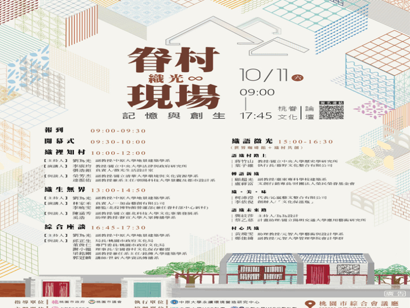 上午場專題座談「織裡知村」,象徵記憶、故事與世代交錯。將邀請中央大學李廣均教授、微光生活設計室負責人張浩鉅進行演講,並由清華大學榮芳杰副教授、朝陽科大連振佑副教授與談,分享不同世代對眷村的故事與觀點,讓記憶不僅傳承,更延續交流。下午「織生無界」則強調文化創新與融合,邀請一加侖藝創公司負責人林家禾、北投中心新村總監李曉雯專題演講,並由臺北科技大學陳涵秀助理教授、靜宜大學奚浩助理教授與談,探索眷村文化共創經營,描繪多元共融的未來。