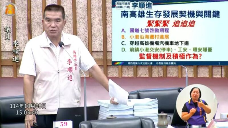 【今傳媒/記者李祖東報導】高雄市議員李順進於8日市長施政質詢中,針對南高雄經濟發展契機與關鍵問題,關切國道7號施工期程、小港沿海遷村、前鎮及小港交安、公園建蓋地下停車場、興建穿越機場地下道等議題,除提出建言,並要求市府團隊盡速研議解決問題。
