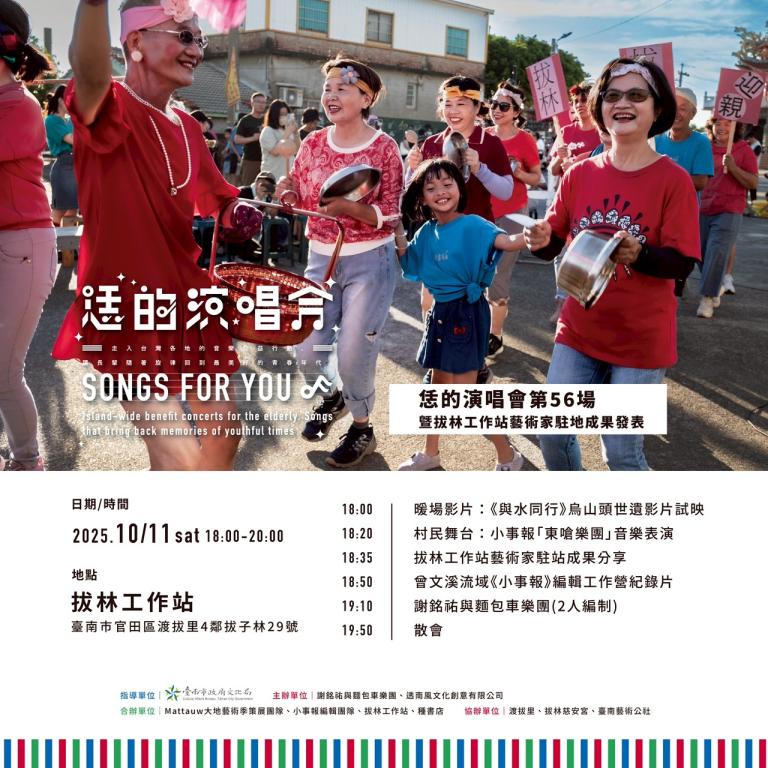 活動於當晚18時開始,「恁的演唱會」特別邀請金曲歌王謝銘祐與麵包車樂團吉他手王東昇,以歌聲吟唱溪流與農事,帶來最貼近土地音樂饗宴;藝術家許怡慈將供應採集嘉南大圳流域野草,熬煮獨具風味「淺山溪畔野草茶」,以味覺連結自然;現場也將試映文資處最新製作影片《與水同行》,以影像呈現嘉南大圳世界遺產潛力價值;此外,拔林工作站藝術家也將分享駐站成果,並播映曾文溪流域《小事報》於今夏營隊紀錄片,展現溪流與地方連結多元面貌,詳細活動資訊請見臺南市文化資產管理處官網或FB粉絲專頁。