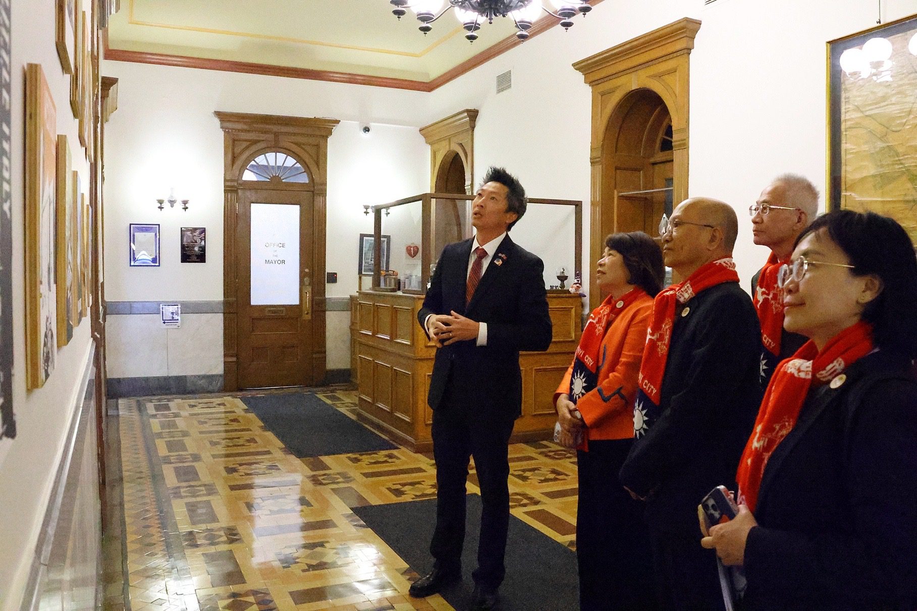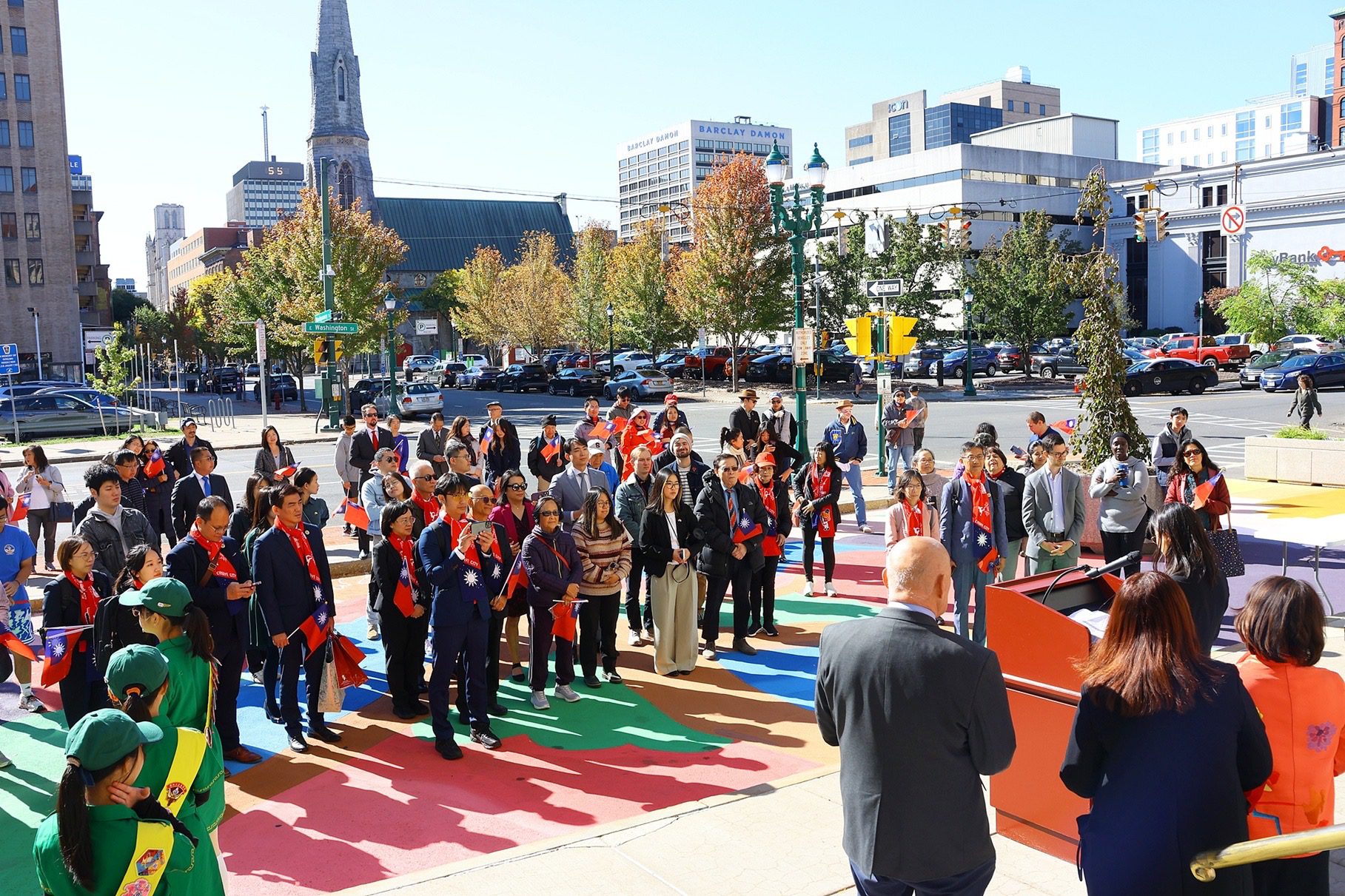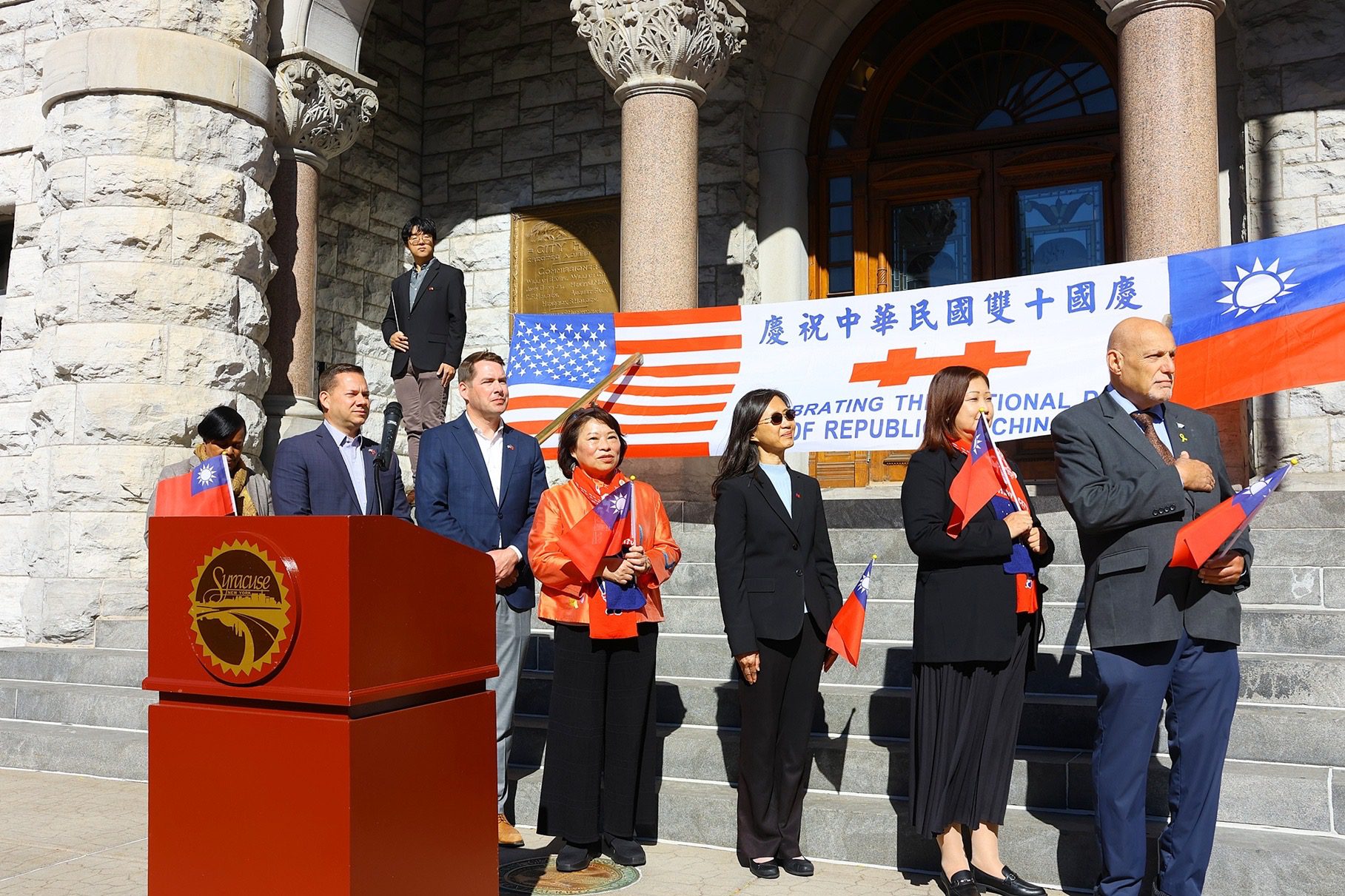 嘉義市長黃敏惠目前正率團在美國紐約地區參訪考察,美東時間10日上午(臺灣時間10日晚間),訪問團在姊妹市雪城市市政廳廣場前參加「慶祝中華民國114年國慶升旗典禮」,與雪城市市長Ben Walsh、駐紐約台北經濟文化辦事處副處長張麗賢公使、紐約上州(城)臺灣同鄉會會長劉忠欽、各界貴賓、美國友人及上百民僑胞、留學生,齊聲祝福中華民國生日快樂。今日升旗前,黃敏惠市長也特別出席嘉大附小與雪城市Manlius Pebble Hill School (MPH)簽訂姐妹校的儀式,為今年國慶升旗更添傳承意義。