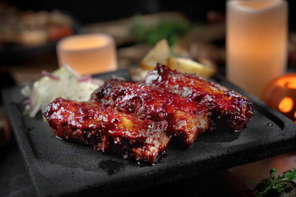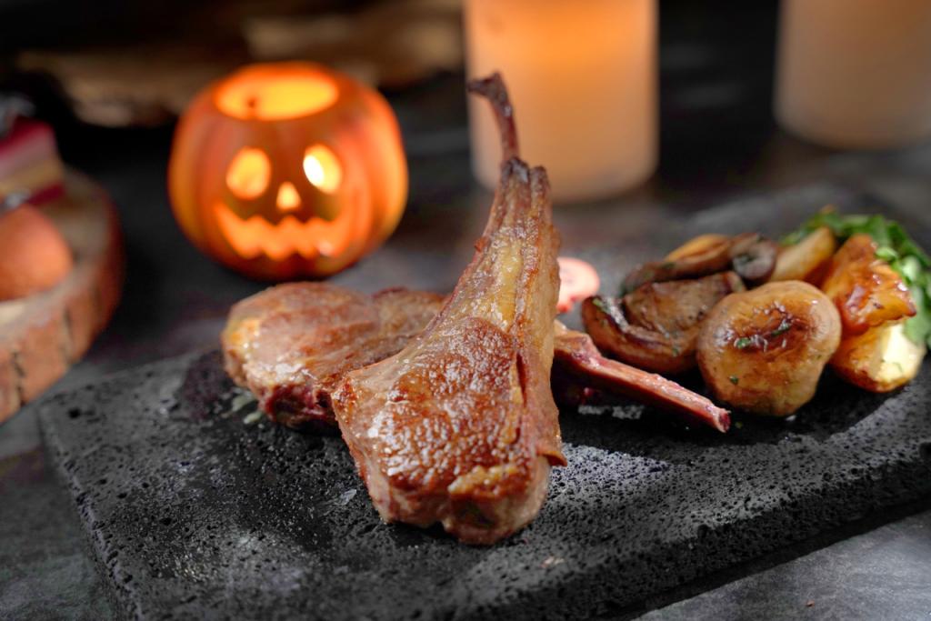 萬聖節饗宴的主餐「碳烤12oz豬肋排佐珍珠洋芋」嚴選台灣豬肋排,以西西里香草與初榨橄欖油低溫醃漬入味,炭火慢烤鎖住肉汁,外層焦香微脆、內裡柔嫩多汁。肉香交織著淡淡煙燻氣息,口感層次豐富。「碳烤羊排佐珍珠洋芋」 採用紐西蘭小羔羊排,經迷迭香與蒜末醃漬後碳烤至五分熟,草本香氣融合肉汁,搭配松露鹽拌洋芋,風味優雅平衡。「碳烤6oz肋眼牛排佐珍珠洋芋」選用美國Prime級肋眼,以西西里直火碳烤,外焦內嫩、香氣濃郁,簡約調味展現極致原味。