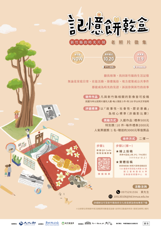 為保存新竹縣珍貴的生活影像與社會記憶,新竹縣政府文化局特別辦理「記憶餅乾盒:新竹縣的時光片刻」老照片徵集活動,廣邀民眾翻找家中的相簿,分享與新竹縣相關的珍貴照片及背後故事。徵件期間自即日起至10月20日中午12時截止,獲入選者還可拿禮券,誠摯邀請大家共同參與,讓影像記憶成為凝聚地方認同的重要力量。