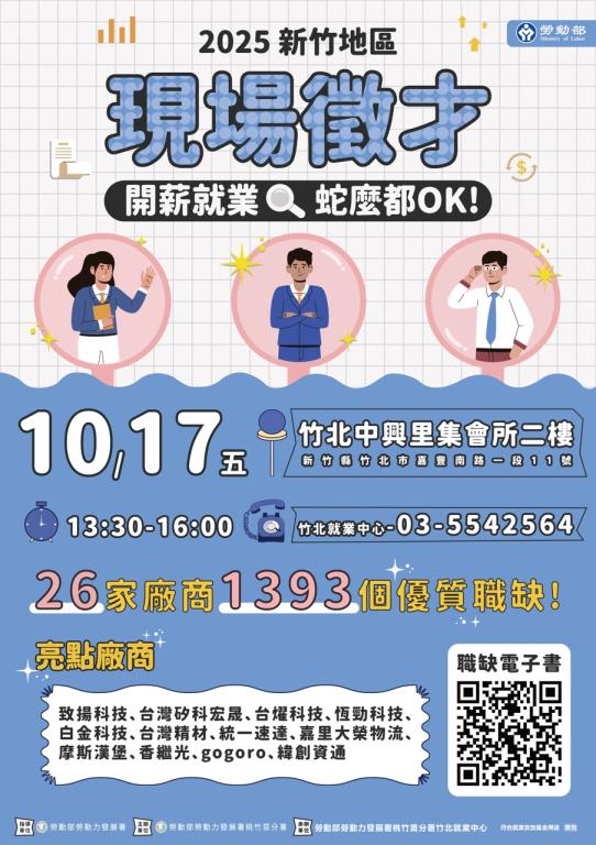 2025年新竹地區現場徵才10/17竹北登場 26家廠商提供1,393個職缺