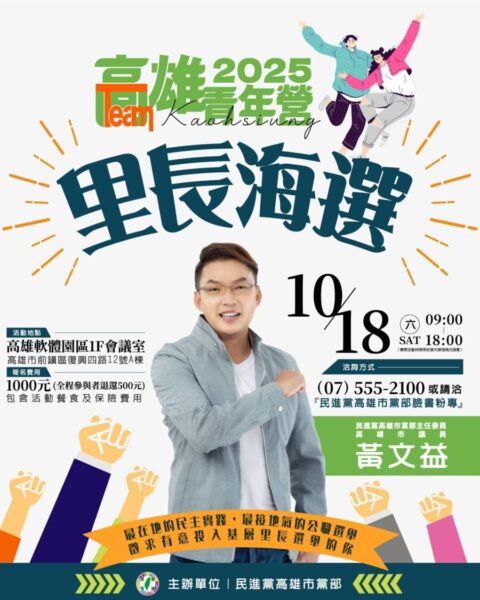 【今傳媒/記者李祖東報導】為鼓勵青年投入基層公共事務,培養未來政治新世代,民進黨高雄市黨部推出「2025 民主種子TEAM TAIWAN 里長海選青年營」,將於10月18日(星期六)在高雄軟體科技園區登場。本次活動為全國首創政治實務培訓課程,期盼透過青年營隊攬才,真正投入里長選舉,讓青年認識基層民主的真實樣貌,成為改變社會的新力量。