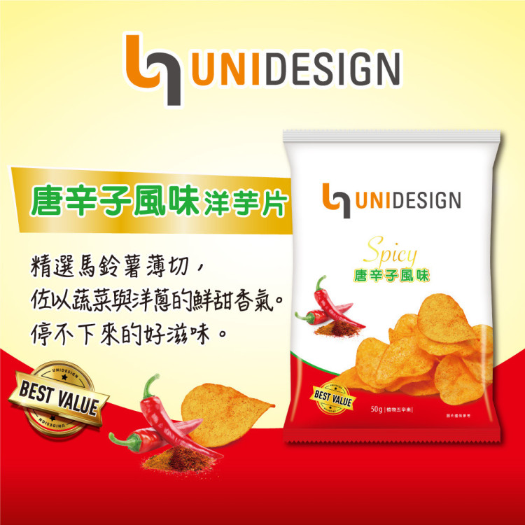 UNIDESIGN 看中洋芋片年輕消費族群的潛力,此次推出「經典原味」與「唐辛子風味」兩大洋芋片口味,且均採用嚴選整顆馬鈴薯切片製成,保證品質。其中,「經典原味」洋芋片將馬鈴薯薄切後,僅以鹽簡單調味,完美融合鹹香與薯香,讓消費者品嘗到洋芋片最純粹的經典滋味;「唐辛子風味」洋芋片則融合多種香辛料,散發出烤焙蔬菜與洋蔥的鮮甜香氣,風味層次豐富濃郁,深受喜愛微辣風味的洋芋片愛好者青睞,让人一口接一口欲罷不能。