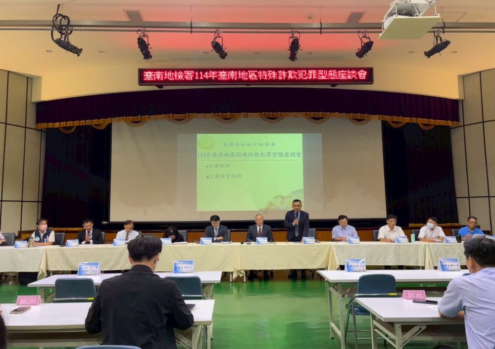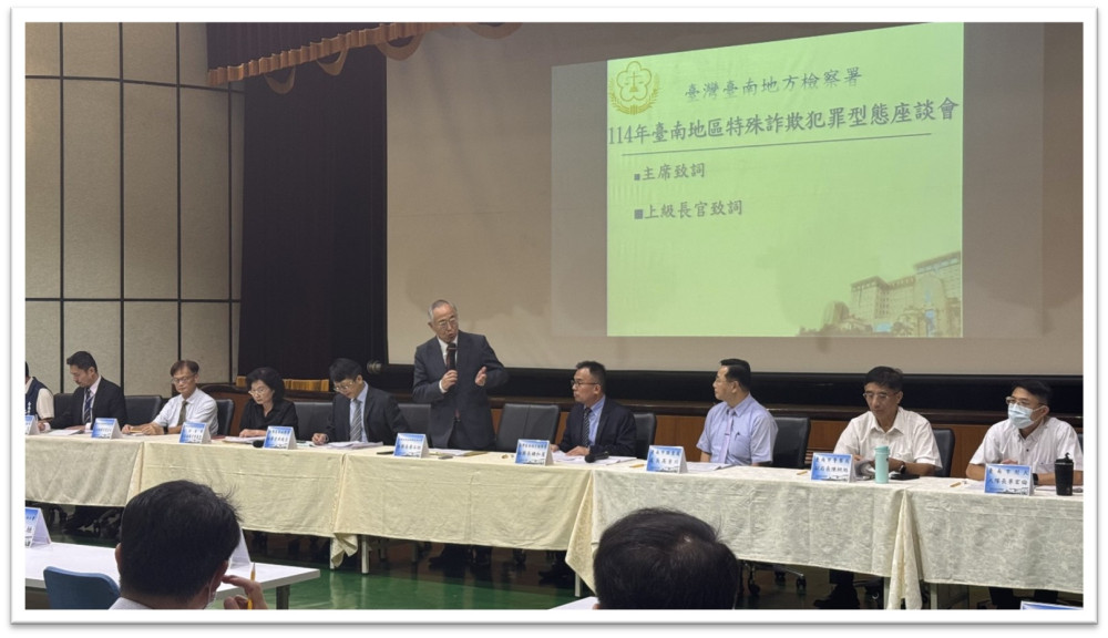 【勁報記者杜忠聰/臺南報導】為強力打擊詐欺犯罪,本署奉臺灣高等檢察署、臺灣高等檢察署臺南檢察分署指示,於114年10月14日下午召開「114年臺南地區特殊詐欺犯罪型態座談會」,由本署鍾和憲檢察長親自主持,邀請臺灣高等檢察署臺南檢察分署黃玉垣檢察長、臺灣高等檢察署卓俊忠檢察官蒞臨指導,法務部調查局臺南市調查處高吉川處長、臺南市政府警察局陳炯旭副局長、內政部移民署南區事務大隊臺南市專勤隊李建雄隊長、臺南市政府地政局蔡奇昆副局長及臺灣銀行臺南創新園區分行陳美花經理等各單位代表蒞臨與會。