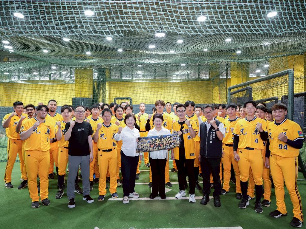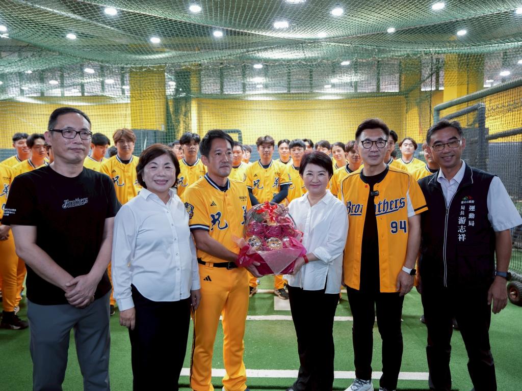 圖說:盧秀燕力挺在地球隊中信兄弟,今(15)日到洲際棒球場鼓勵全體隊員並致贈水果禮盒和能量果凍,為選手們加油打氣。(中市運動局提供)