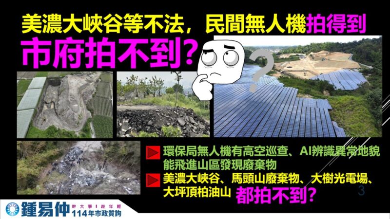談到近期全台關注的「美濃大峽谷事件」,鍾易仲嚴肅質疑:十幾年的坑洞為何民間空拍機拍得到,市府卻拍不到?他指出,高雄市早有無人機隊,包括環保局與消防局皆有配備,且市府常宣稱擁有AI智慧系統,但這次卻完全沒發現問題,顯示市府監督機制明顯失靈。