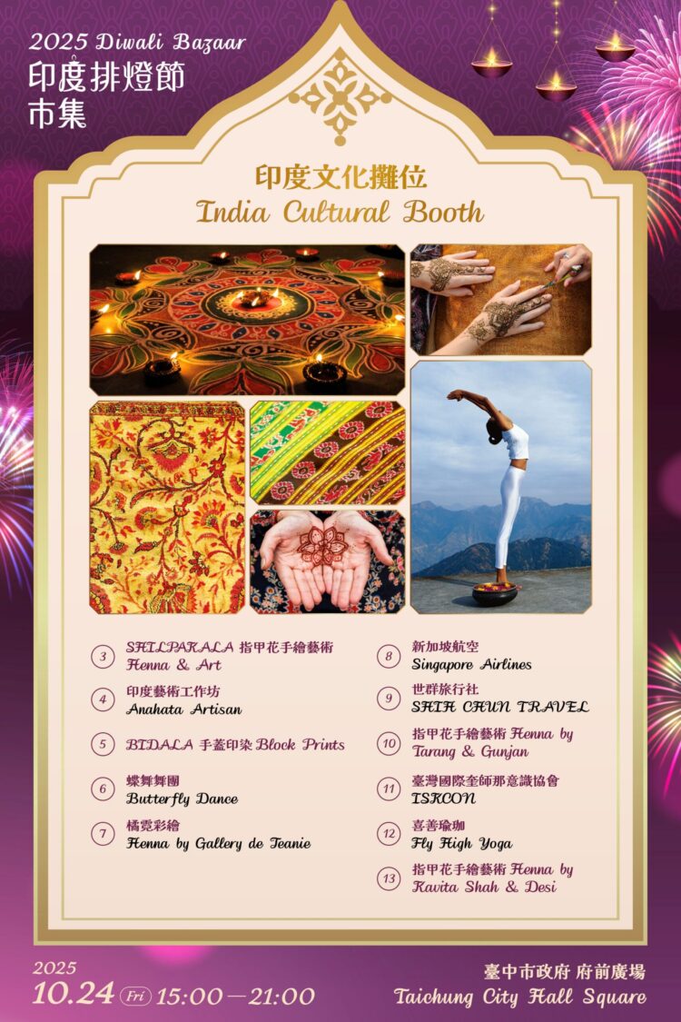 民政局補充,活動現場亦設有大型藍果麗(Rangoli)地畫與互動點燈區,提供民眾拍照打卡;另活動開幕式亦邀請台中在地原住民舞團「泰雅原舞工坊」共同演出,以融合編舞呈現台印文化交融的精彩面貌。