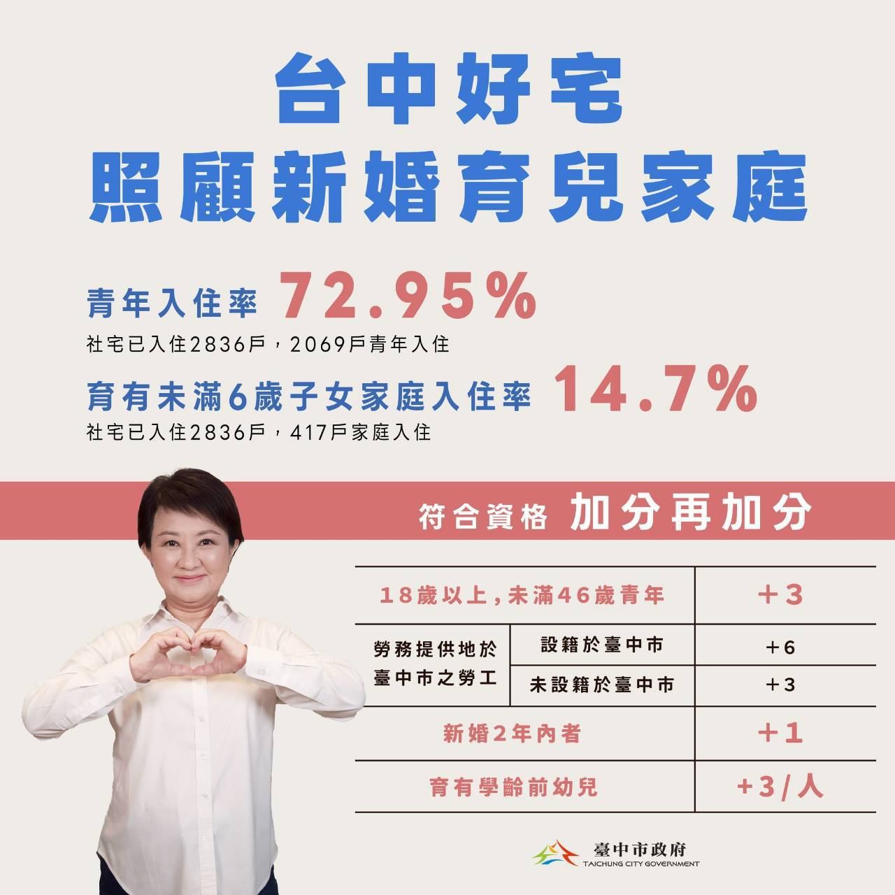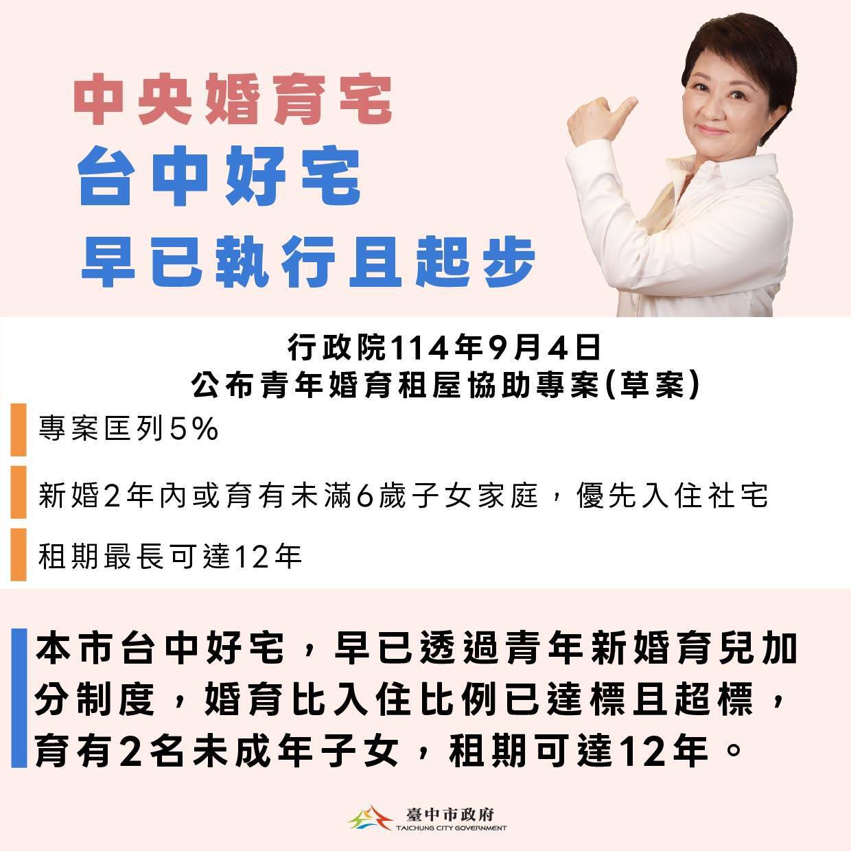 市府強調,這些創新與加碼措施展現臺中市以家庭為核心、以青年為優先、以育兒為導向的政策精神,結合教育、托育與社福資源,打造全方位的婚育支持網絡,使台中成為全國最友善青年與育兒家庭的宜居典範。