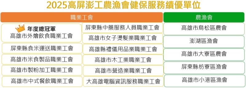 中央健康保險署(下稱健保署)高屏業務組為提升便民服務品質,持續由轄區各工農漁會投保單位協助服務會員辦理健保各項業務,並透過評比活動,互相觀摩,以期提供更優質服務。高屏業務組於今(17)日舉辦114年高、屏、澎地區工、農、漁會投保單位績優表揚,本次參與評比共有791家,其中16家脫穎而出,並由高雄市外燴飲食職業工會榮獲總冠軍,該工會強化網路申報作業,積極宣導會員下載健保快易通APP、加入健保署LINE及辦理虛擬健保卡等服務,堪為典範。另高雄市鳥松區農會與屏東縣中藥服務工會連續8年獲獎,配合健保業務數位化及宣導健保各項重要政策。