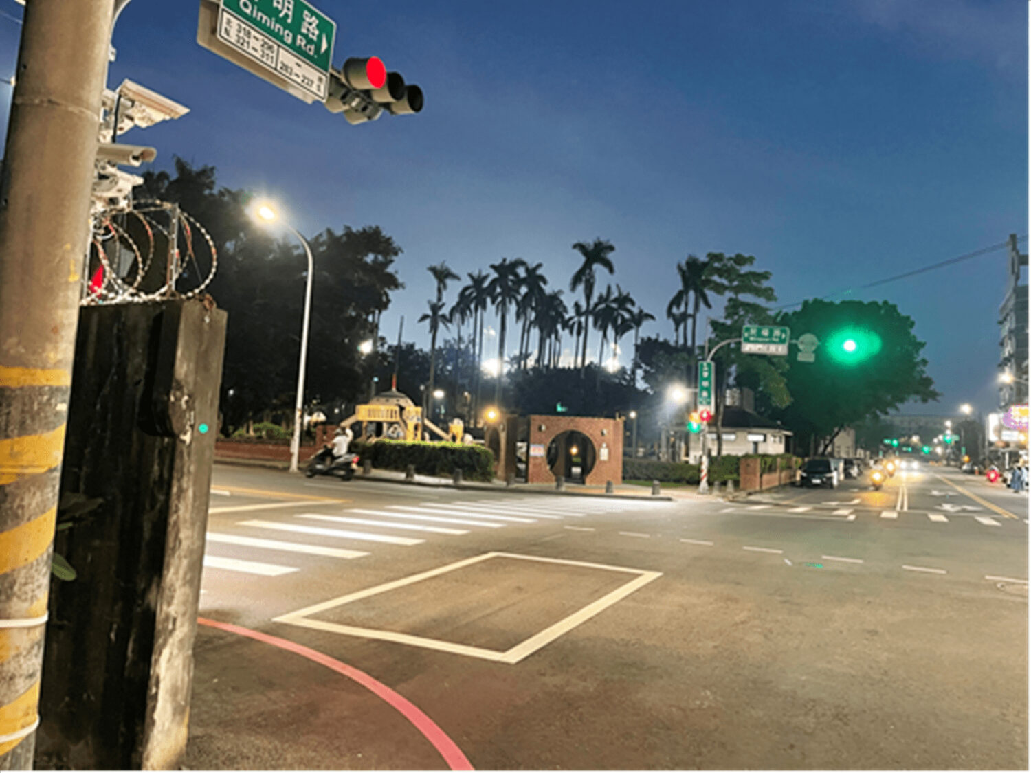 嘉義市正以「安全、人本」為核心推動交通環境之營造,近期除加強人行道建置與改善、行穿線後退、行人庇護島設置、左轉附加車道規劃及增設行人專用號誌之外,此次更加強路口行穿線照明之提升,在原有號誌共桿計畫及高燈計畫推廣之外,也引進了行人輔助照明系統,大幅提升行人夜間穿越路口之安全。在此也呼籲用路人、行人通過路口請注意號誌燈號及左右來車,安全通過路口,切忌邊走邊低頭滑手機,另外車輛行經路口及行穿線時,務必注意路口前車及行人之安全,禮讓通過。