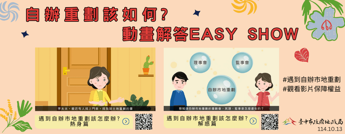 地政局進一步說明,考量Q&A文字解釋較不易理解,故設計以動畫之方式呈現艱深生硬的重劃法令及業務內容。現已完成「遇到自辦市地重劃怎麼辦?」-熱身篇及解惑篇共兩部影片,採用貼近生活的對話方式,說明自辦市地重劃實務中常見的問題,協助民眾輕鬆理解相關內容,同時強化地政局網站問答專區的宣導成效。