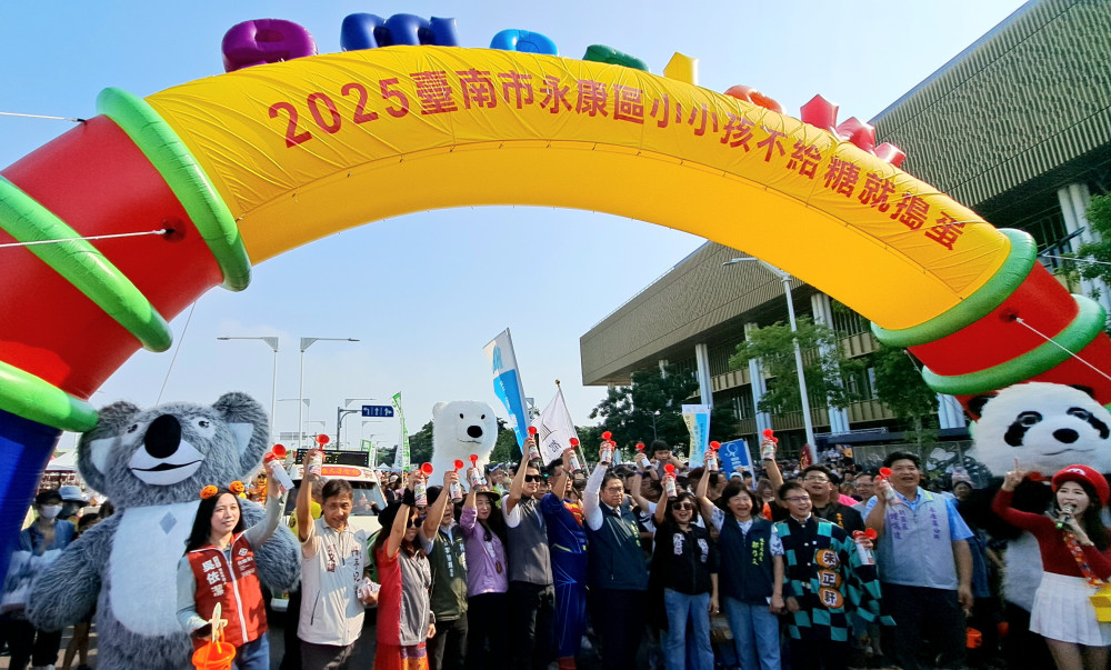 「2025臺南市永康區小小孩不給糖就搗蛋」18日在臺南市立圖書館新總館熱鬧登場,由永康區公所與康橋商圈商業發展協會共同舉辦,臺南市長黃偉哲化身魔法師,與大小朋友一起變裝踩街,大喊「不給糖就搗蛋」,現場笑聲不斷、氣氛嗨到最高點。