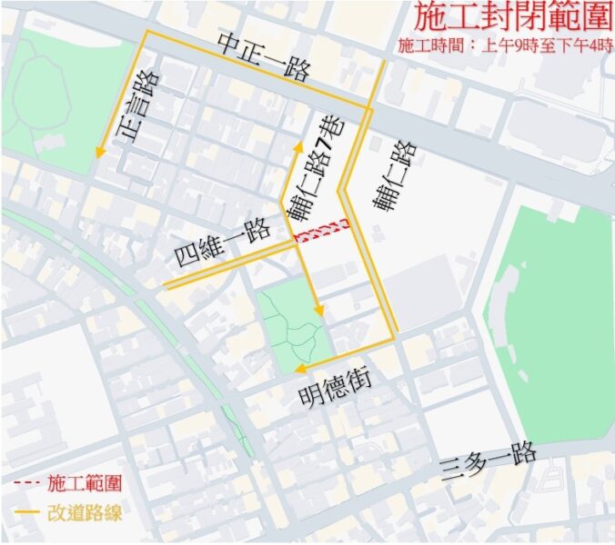 【今傳媒/記者李祖東報導】O9聯開案周邊都市計畫道路開闢工程於114年10月27日(星期一)至114年11月7日上午9點至下午4點進行排水箱涵施工作業,封閉四維一路(輔仁路至輔仁路7巷路段),民眾可改由輔仁路7巷、明德街、正言路等道路行駛。