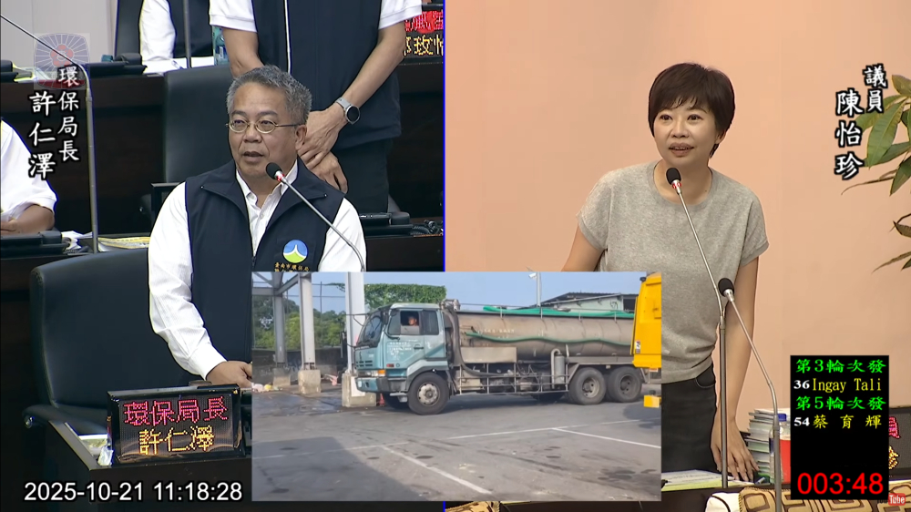 【勁報記者杜忠聰/臺南報導】台南市議員陳怡珍21日於市議會質詢時指出,台南市目前水肥清運與處理量嚴重不足,導致業者每日深夜排隊等候進場,清運效率低落,不僅影響市民生活品質,更嚴重衝擊業者生計。她強調,市府應立即啟動跨局處協調,全面檢討水肥處理量能,並加速修復停收中的海興段管線,以解決長期困境。