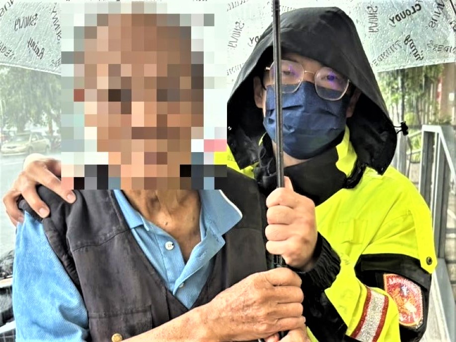 經了解,該名楊姓老翁平時與年邁妻子同住,當日下午獨自徒步外出運動,怎料越走越遠,由於楊翁年歲已高雙腳無力,走至垂楊路與和平路上的捐血站外,便無力繼續行走,此時天空降下滂沱大雨,只得借捐血站的屋簷躲雨,一旁民眾上前關心,然而楊翁患有失智症狀,民眾便打電話報案請求警方協助。