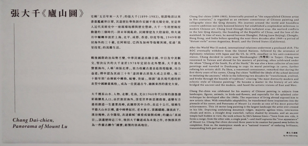 〈廬山圖〉是張大千晚年潑墨潑彩傑作,也是存世最大整絹繪畫。故宮博物院蕭宗煌院長稱其為張大千一生尺寸最大、過世前用功最力的代表作,技法精湛、氣勢磅礴,可與歷代山水名家呼應;臺南市長黃偉哲表示,該作 2019 年被核定為國寶,是清末民初美術「現代化」歷程的里程碑。