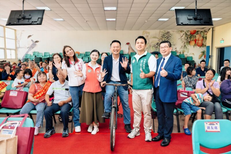 ▲桃園市114年龜山區長青及敬老表揚活動,表揚長青及敬老楷模各34位。蘇俊賓副市長(中)騎乘復古腳踏車與貴賓一同進場,象徵帶領大家回到「時光印記」。(圖/龜山區公所提供)