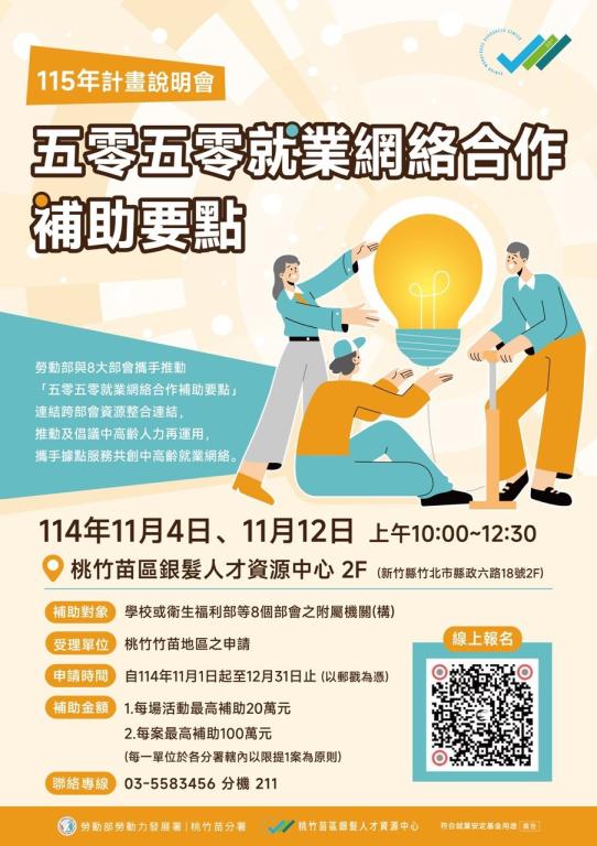 勞動部5050就業網絡合作計畫 桃竹苗分署說明會11/4、11/12登場