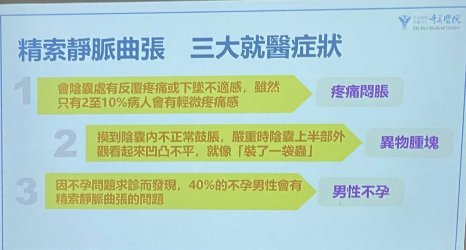 奇美醫院泌尿外科主治醫師謝昆霖指出,精索靜脈曲張發生率大約10到15%,平均每九位男性就有一人有此問題,但多數人沒有症狀因而容易忽略。臨床觀察,就醫的病人主要有三類表現:1.摸到陰囊內不正常鼓脹,嚴重時陰囊上半部外觀看起來凹凸不平,就像「裝了一袋蟲」。2.會陰囊處有反覆疼痛或下墜感。3.因不孕問題求診而發現,研究文獻提到約40%的不孕男性會有精索靜脈曲張的問題。