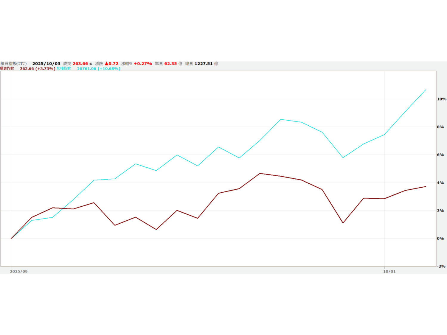 可以觀察的指標是加權指數與櫃買指數的對比。在9月份,淺藍色的加權指數(大型股)比起櫃買指數(中小型股),漲幅更多。當10月加權指數再次創高,櫃買指數並沒有跟上。