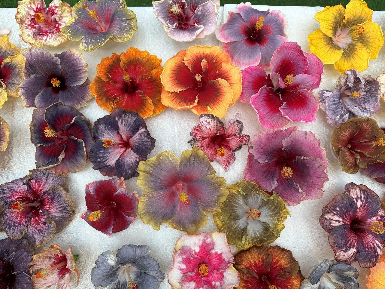 本次展覽邀集全台7位頂尖朱槿育種家及多位花友共同參展,包括「妮卡」、「懶雲窩」、「綺麗」等知名系列。花色變化從純白到黑藍、橘紅、粉紫,甚至有三色花瓣、重瓣斑紋的夢幻組合,宛如花中藝術品,展現出臺灣朱槿育種的無限創意與多樣性。