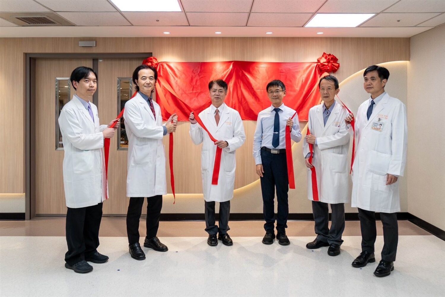 基隆長庚醫院23日舉行「精準醫療檢查中心」啟用儀式,圖左起為胃腸肝膽科醫師陳碩為、副院長詹益聖、院長吳俊德、基隆市衛生局長張賢政、副院長李立夫及孫啟欽。