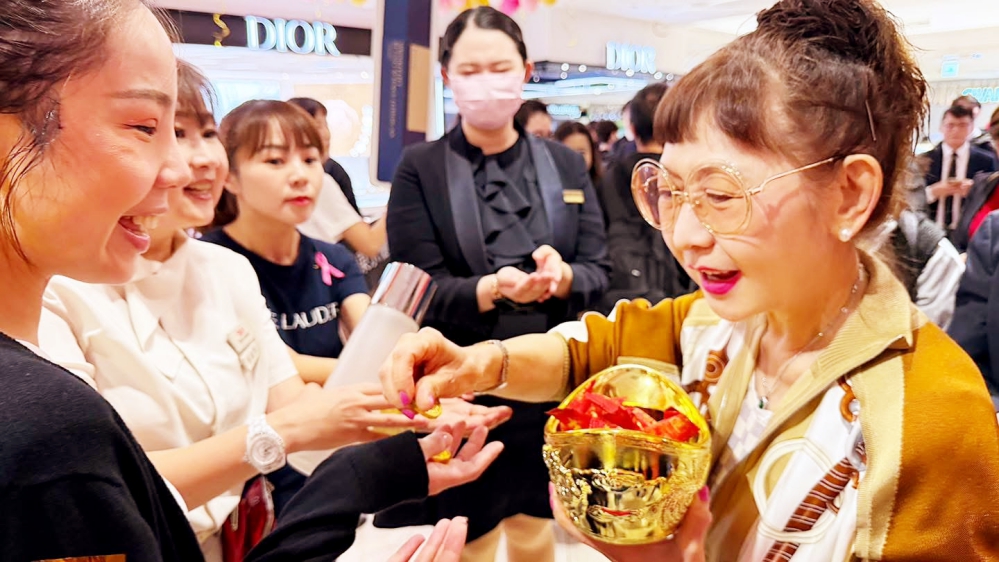 ▲桃園遠百週年慶今(10/23)熱鬧開跑!遠東百貨徐雪芳總經理親臨現場,發放金幣討喜氣,寓意業績長紅、好運連連。(圖/桃園遠百提供)