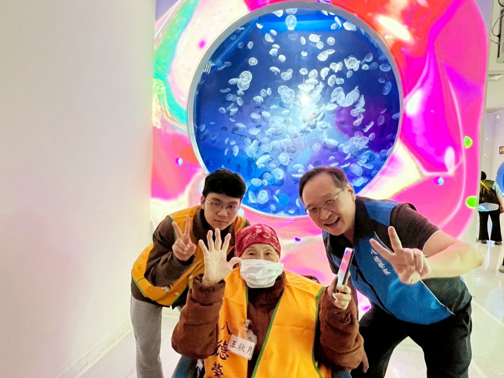 活動過程中,長輩們在志工與照服員的協助下,一同欣賞絢麗的水母、活潑的企鵝及多樣的海洋生物,紛紛驚呼連連、拍照留念。其中最令人感動的是胡伯伯與胡媽媽,夫妻倆平日分別居住於養護房與安養房,難得能一同出遊,手牽手漫步於水族館中,臉上滿是幸福的笑容,讓現場人員都深受感動。
