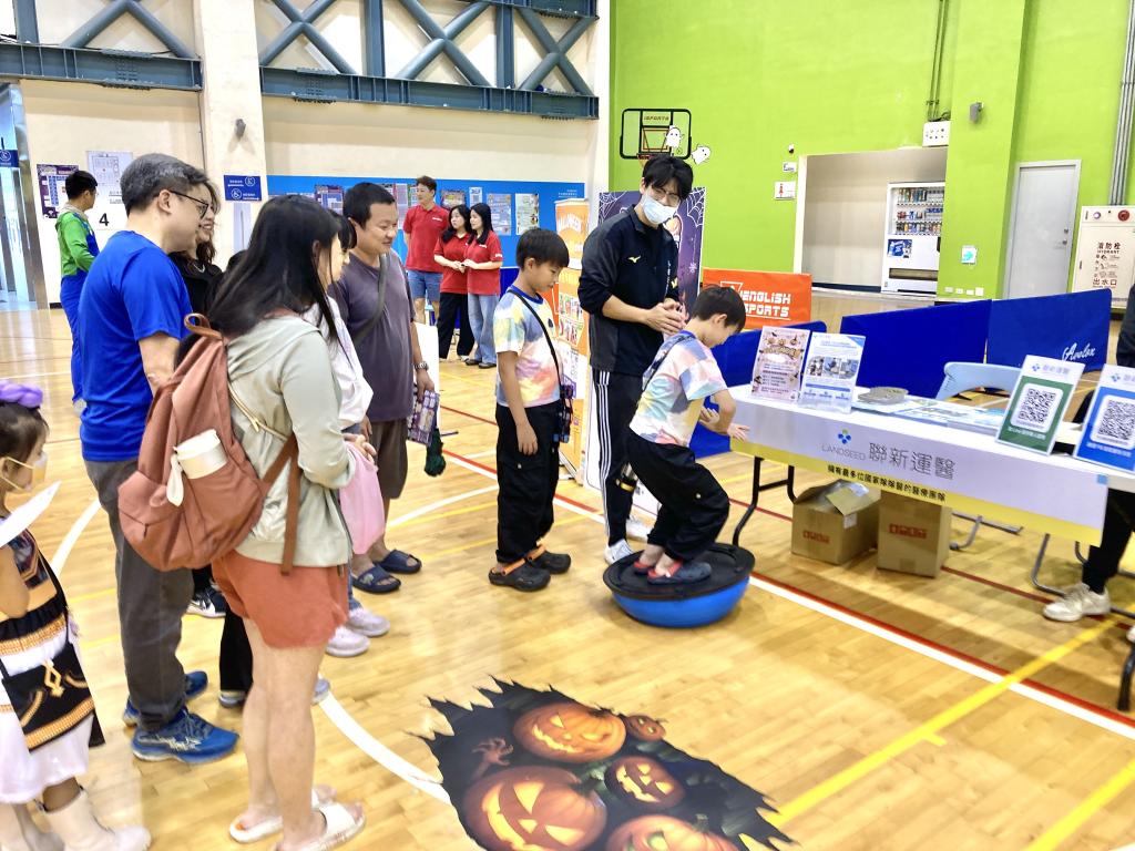 ▲竹北國民運動中心「第六屆親子公益運動嘉年華」盛大登場,聯新運醫於現場設攤吸引大小朋友爭相參與平衡關卡,體驗運動樂趣與多元特色。