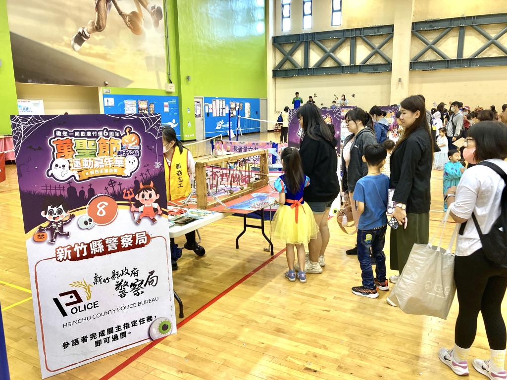 ▲竹北國民運動中心「第六屆親子公益運動嘉年華」盛大登場,竹縣警察局婦幼隊設攤闖關送獎品,吸引眾多親子排隊相參加。