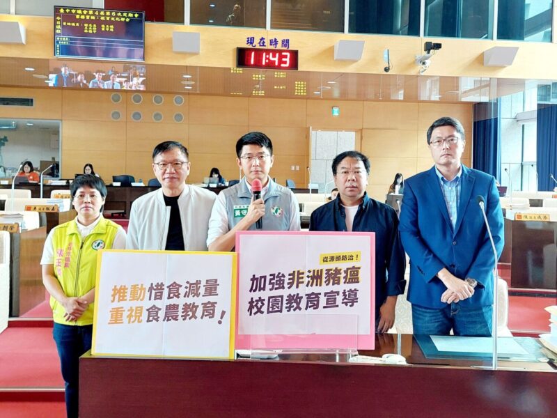 市議員黃守達、謝志忠、張玉嬿、王立任、林德宇於昨(23)日聯合業務質詢中共同指出,台中淪為防疫破口,要求教育局積極處理學校營養午餐的廚餘問題,並加強校園內對於防治豬瘟的教育宣導,從源頭阻斷疫情擴散。