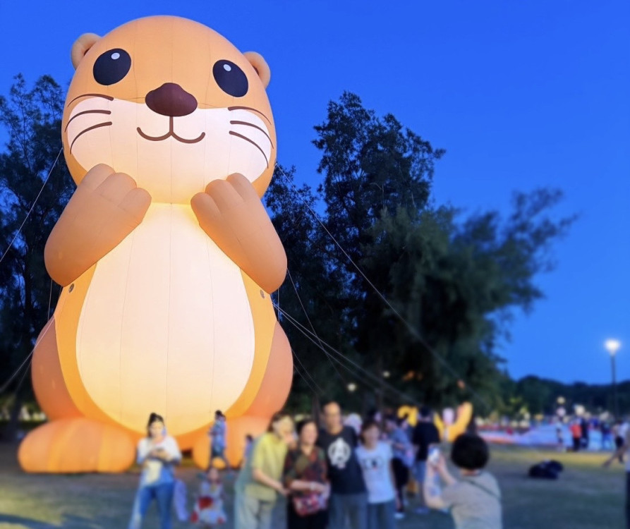 觀光處說明,巨型氣偶展共有3座,14 公尺高「阿特」以歐亞水獺為原型,展現金門自然生態與親子友善觀光精神;6公尺高「風獅爺」象徵信仰與守護;而「戴勝」則代表金門豐富生態鳥類資源,三者充滿金門感性,共同傳遞「自然、生態、信仰與守護」核心價值。