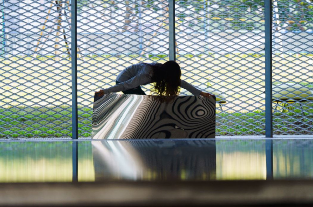 表演藝術家林祐如、田孝慈與導演陳冠宇、聲音創作者廖海廷、服裝設計師蔡浩天合作共創的〈慢慢散步,在美術館〉。觀眾除可自由參與11/1及11/8的現場演出外,也能於綠美圖大廳服務台掃描QR code觀看影像檔案,跟著影片中的表演者步伐自行探索綠美圖空間。